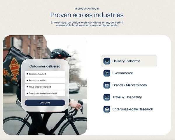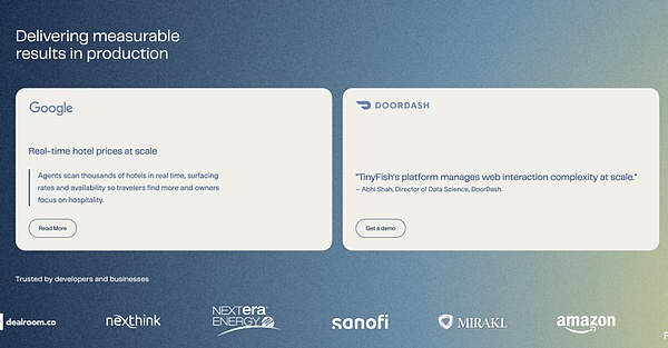 理论再好也需要实践验证,而TinyFish在这方面的表现让我印象深刻。他们已经在多个行业的头部企业中实现了大规模部署,这些案例展示了企业级Web Agent的真实商业价值。目前TinyFish运营着数十万个企业级Web Agent,每月为财富500强公司和高增长企业执行数百万次操作,这种规模本身就说明了技术的成熟度和市场需求的真实性。