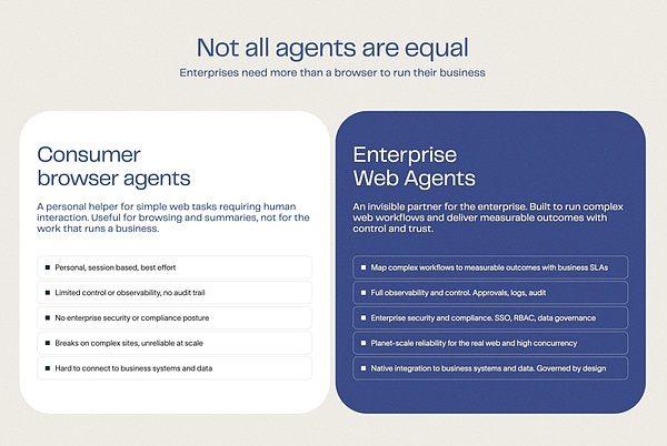 他们的企业级Web Agent具备几个关键特征,这些特征让我看到了真正的技术突破。首先是结果导向的设计,这些agent不是为了展示技术能力,而是为了实现可衡量的业务结果,比如收入增长、成本节约或市场份额提升。其次是完整的工作流程覆盖,它们能够处理整个流程的每个阶段,而不仅仅是孤立的任务。第三是企业级的可靠性和合规性,这意味着它们能够满足全球大型组织在安全性、治理和正常运行时间方面的要求。