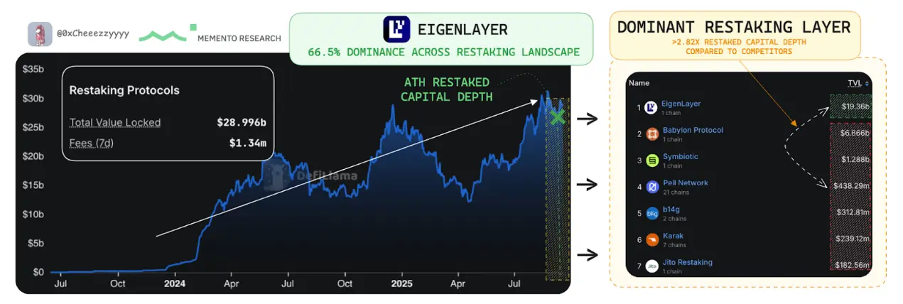 EigenLayer 是首个开创共享安全的平台,正式确立了全新的“信任即服务”类别,并催生了如今价值 289 亿美元的再质押市场。