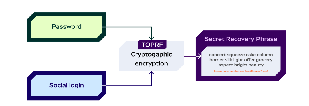 他的做法很简单,用户要登录一个邮箱并且设置一个密码,两者结合形成一个叫 TOPRF(Threshold Oblivious Pseudorandom Function 阈值不经意伪随机函数)的东西,用这个去加密了用户的私钥,被加密的私钥自然可以备份。