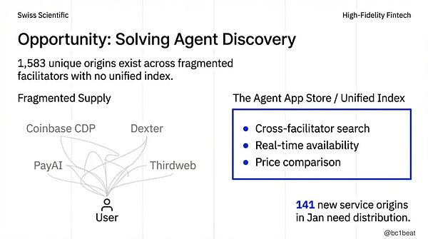 今天,一个代理如果想要寻找服务,必须分别查询 Coinbase CDP、Dexter、PayAI Network 以及 thirdweb,每一个平台都有不同的 API 和返回格式。