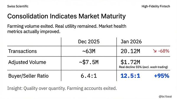 Artemis的分析发现,12 月交易量中有 47% 属于非自然的刷量行为。在调整后,真实的下降幅度更接近55%。