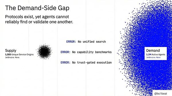 没有跨促成平台的统一搜索。没有能力基准来证明代理究竟能做什么。没有将 ERC-8004 验证机制与 x402 支付执行连接起来的信任门控体系。