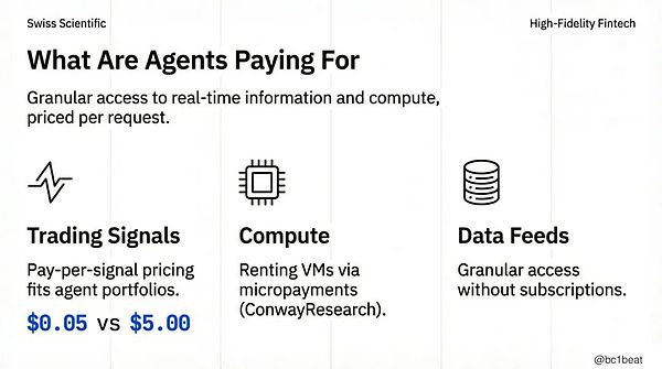 第一类是交易信号。按单条信号付费的定价方式非常契合代理投资组合:小账户每条约$0.05,机构级可达 $5.00。