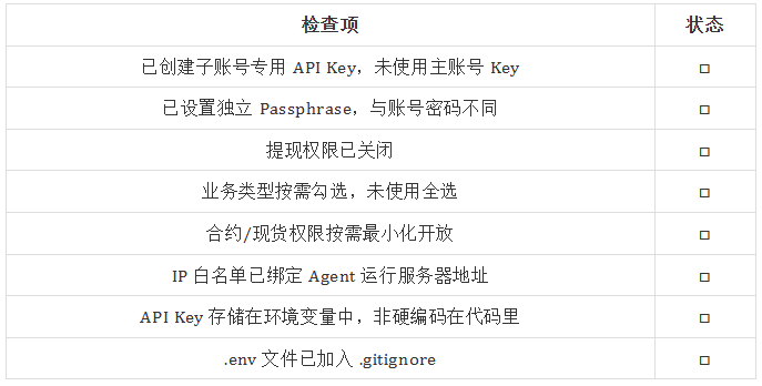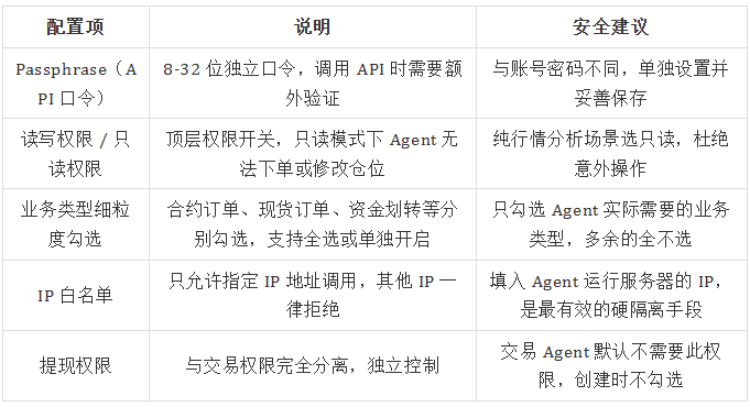 AI Agent 的核心操作依赖于 API 接口,因此平台在 API 权限设计上通常需要支持细粒度控制,例如交易权限划分、IP 来源限制以及额外的安全验证机制。通过这种权限模型,用户可以仅向 Agent 授予完成任务所需的最小权限范围。