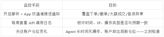 在 AI Agent 自动交易场景中,安全问题往往不会表现为一次性的异常行为,而是可能在系统持续运行的过程中逐步发生。因此,除了账户安全与 API 权限控制之外,还需要建立持续的交易监控与异常检测机制,以便在问题出现的早期阶段及时发现并干预。