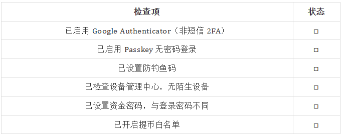 · 启用提币白名单:只有预先添加的地址才能提现,新地址需要 24 小时审核期