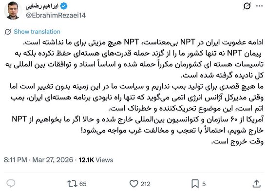 伊朗议会国家安全与外交政策委员会发言人易卜拉欣·雷扎伊就相关事件表示,伊朗正在考虑退出《不扩散核武器条约》。他指出,《不扩散核武器条约》不仅未能保护伊朗免受核大国袭击,反而使伊朗核设施多次遭到攻击,国际文件和协议也遭到完全忽视。