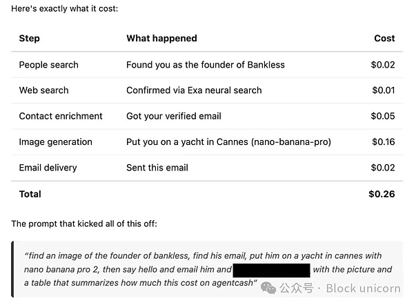 在最近与团队的一次通话中,我观看了一个演示:一位代理找到了一张“Bankless 创始人”的图片,将其导入 Nano Banana 中,编辑成 RSA 在游艇上的照片,然后通过电子邮件发送给我。这花费了 26 美分。另一个例子是,与 AgentCash 合作的 Joe 分享了他如何在公园里捡到一张丢失的身份证,拍了照片,然后让他的 OpenClaw 使用 AgentCash 查找失主的联系方式,以便归还身份证。他们现在正在一起吃午饭,整个过程只花了大约 30 美分。