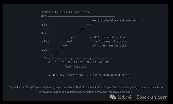 在快速时钟的 CRQC 上,9 分钟攻击是可行的,这意味着在单个比特币区块间隔内,有大约 41% 的概率可以推导出私钥。这意味着针对所有交易类型的在花费攻击都将成为现实。
