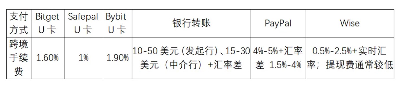 U 卡的手续费往往显著低于传统支付渠道,这点在跨境支付方面尤为明显。下文比较了多种支付方式的跨境手续费: