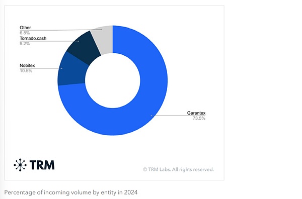 先确定交易所运营所在地,并确认其是否向俄罗斯等高风险司法区提供服务——威胁行为体(以及随之而来的可疑电汇)往往集中流向这些区域。TRM Labs 近期报告指出,来自前苏联地区的俄语威胁行为体长期主导各类加密相关网络犯罪,从勒索软件到非法交易所、暗网市场不一而足。仅就制裁风险而言,流入俄罗斯 Garantex 交易所的资金便占全球所有被制裁实体加密总量的 82%。