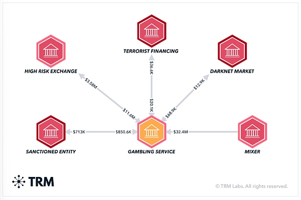 区块链的透明性使许多往来关系可见并可被分析。若某加密托管商的主要对手方包括高风险交易所、博彩平台、支付处理商、零售场外柜台及 P2P 平台等易被大规模利用的业态,则与其相关的电汇可能面临更高的监管或声誉风险。