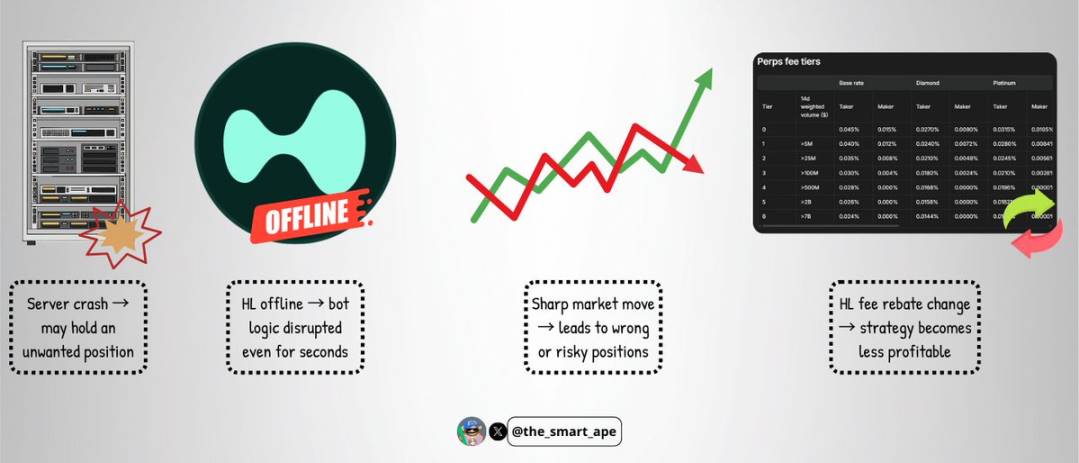 交易所故障:虽然罕见,但 Hyperliquid 平台若出现宕机或故障,可能在几秒内打乱机器人的交易逻辑;