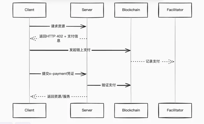 x402 采用 402 状态码命名,属于无状态的链上支付协议。通过在 HTTP 请求头中加入 “x-payment” 字段,并借助新增角色 Facilitator(协助者)在链上负责验证,告知服务方后,即可完成一次性支付任务。