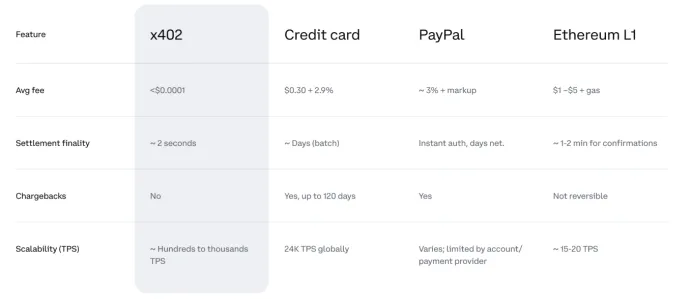 这套协议的理论对比,看起来充满断代级优势。Coinbase 基于以下 4 点进行比对:平均手续费、确定时间、退款能力、TPS(并发数)。