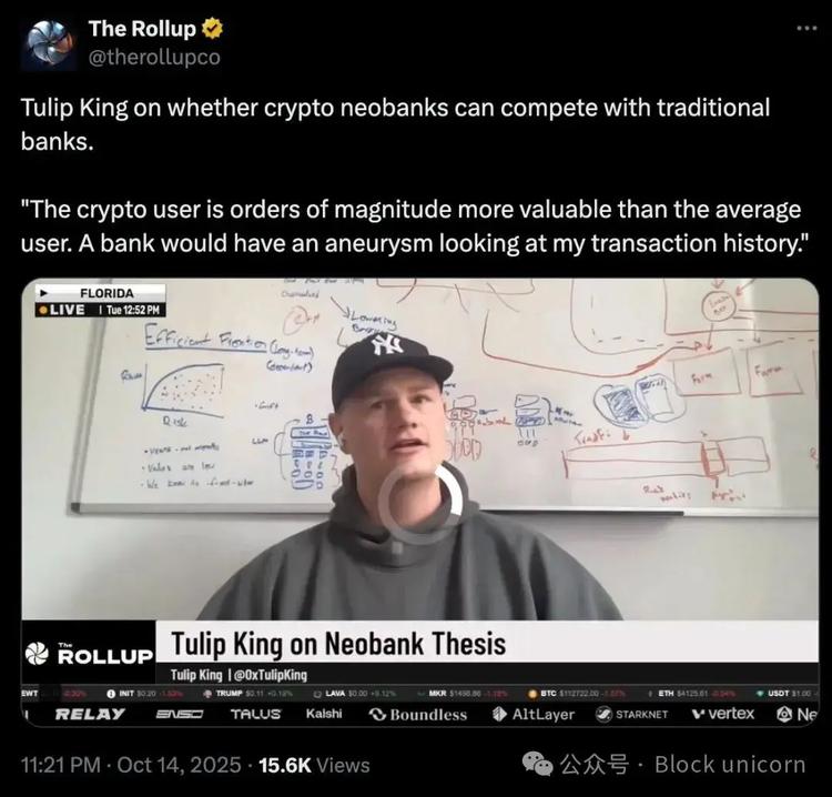 加密货币新银行可以提供传统银行无法比拟的收益。它们利用的是支撑稳定币的国债收益,只是为了合规性而增加了一个支付流程。传统银行无法在利率上与之竞争,因为它们的成本结构从根本上就更高,例如实体网点、遗留系统和合规方面的开销。而新银行则省去了所有这些成本,并将节省下来的资金回馈给用户。