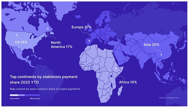 在出金端,变化更为显著:2025 年,CoinGate 平台上 85%的商户结算都选择了以稳定币形式发放。这表明,对于企业而言,稳定币已不仅仅是另一种支付选项,而是跨境结算、汇款以及 B2B 资金流动中首选的结算层。