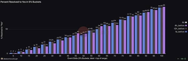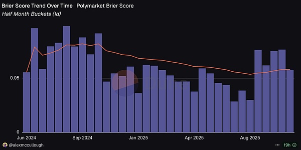 数据来源:https://dune.com/alexmccullough/polymarket-brier-score & https://dune.com/alexmccullough/how-accurate-is-polymarket