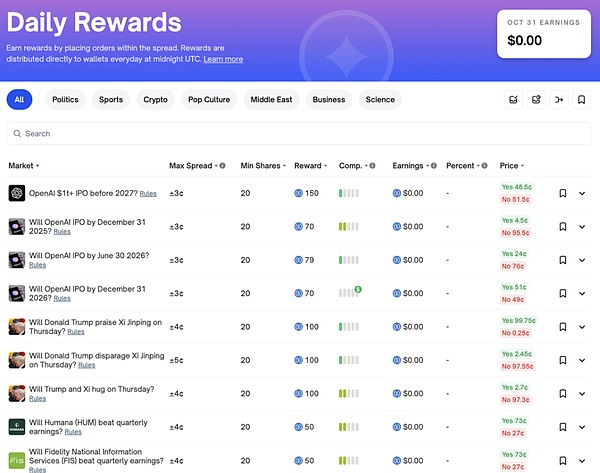 虽然 Polymarket 早期为解决冷启动流动性而采用 AMM 机制,但其随后在 2022 年末转向 CLOB(中心限价簿),以提升做市策略空间与专业交易体验。这一技术产品发展路径,使其在“可验证结算”“可组合数据层”与“专业化交易体验”上形成体系化护城河。此外,为鼓励用户在订单簿挂单提供流动性,Polymarket 推出限价单流动性奖励计划,如果用户在订单簿中以接近市场中间价的位置挂出买单或卖单(起到做市商作用),即可获得每日奖励。