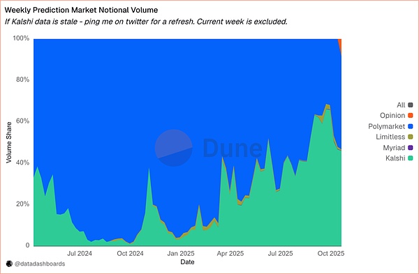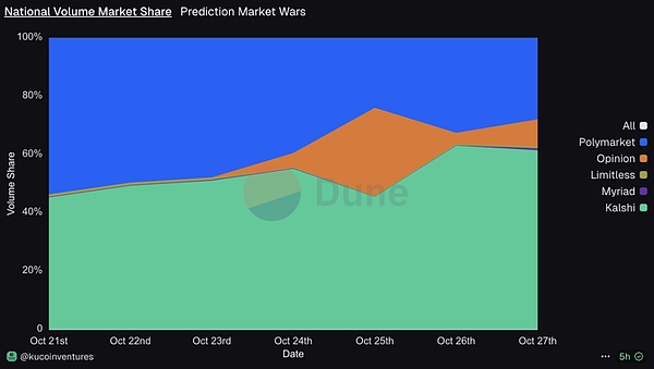 另外,Opinion Labs、Limitless、Myriad 这类“激励驱动 + 高频事件”平台,在个别单日的链上预测成交量甚至能高于 Polymarket(例如:10 月 25 日,Opinion 单日成交量 1.69 亿美元,略高于同日 Polymarket ),说明赛道长尾亦会对头部产生短期扰动,不能再简单理解成“就两家在做”。
