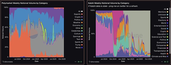 值得注意的是,用户交易行为亦发生变化。从整体预测事件上看,在体育赛事和政治预测板块的下注量均要超过 Crypto 领域本身。不同平台亦是围绕用户行为形成了不同的风格和特点。Polymarket 在事件发展上相对更为均衡,以政治和体育为核心,逐渐通过扩大 Crypto 短线级别的价格预测市场以加强多元化竞争优势。而 Kalshi 则显著偏科,基本集中于体育板块,交易量占比高达 85% 以上。