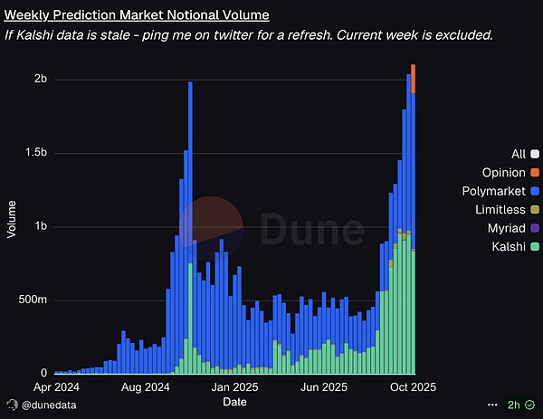 数据显示,Kalshi 在 9 月第二周的周度成交超过 5 亿美元、份额占比约 62%,阶段性反超 Polymarket;其后在 10 月第 3 周,预测市场行业周成交 >20 亿美元的纪录又由二者共同抬升,头部双寡头格局基本确立。