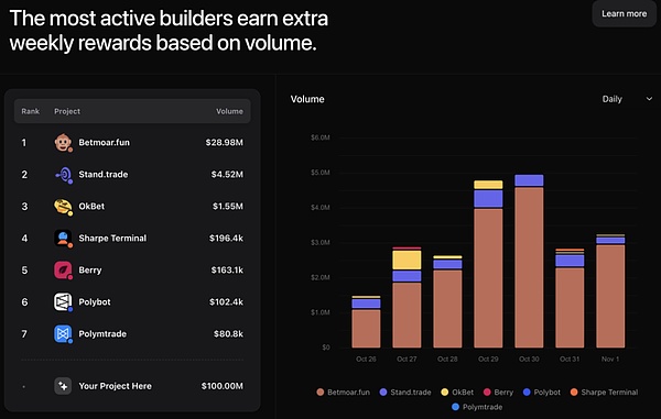 就目前而言,Polymarket 生态应用相对最为活跃,特别是在 Trading Bots 领域,第三方开发者围绕 Polymarket API 和 Polygon 链构建了多样化的交易工具集群。Polymarket 刚在不久前启动了 Polymarket Builders Program 以支持终端工具的发展,并将以周维度奖励活跃开发者。现阶段被收录至 Grant 清单的是以下 7 个,其中老牌终端 Betmoar.fun 的每日交易量最高,最高单日一度逼近 $5M,然而多数 Polymarket Trading Bots 的每日交易量低于 20 万美元,占比 Polymarket 日交易量的不足 1%。除此之外,大部分平台主要以零费用和潜在空投预期以期获取市场份额,真实情况未知。