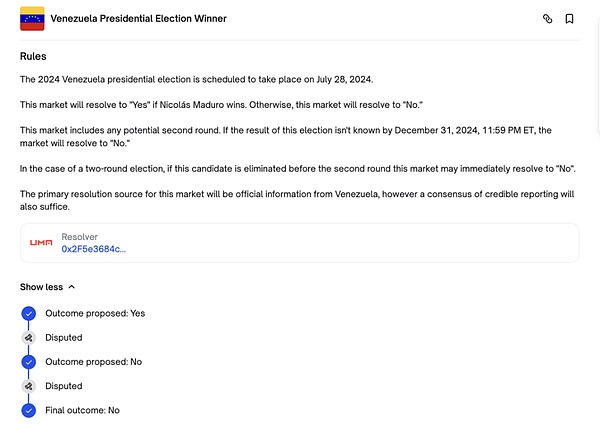如果说“泽连斯基西装案”的核心是规则的模糊性,那么这个价值 610 万美元的“委内瑞拉选举案”,则提出了一个更深刻的问题:当预言机的“社区共识”与市场白纸黑字约定的“客观规则”发生冲突时,应该以谁为准?