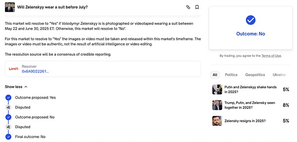 当时 Polymarket 上一个关于“泽连斯基是否会在 7 月前穿西装?”的热门市场,吸引了高达 2.4 亿美元的交易量。该事件的最终裁决引发了巨大的市场争议,暴露了当前预言机治理体系在面对规则模糊性时的脆弱性。