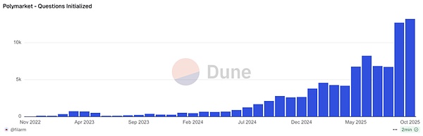 预测市场最大的优势是其多样性—万物皆可预测,例如无门槛的 Polymarket 上,其平台创建活动在 2025 年经历了爆炸性增长。从 2024 年每月仅有数百到上千个新市场的平稳状态,激增至 2025 年下半年每月创建超过 1 万个新市场的火热现状。这证明了平台极高的活跃度和社区参与度,用户正在以前所未有的速度,将现实世界的各类事件转化为可交易的市场。