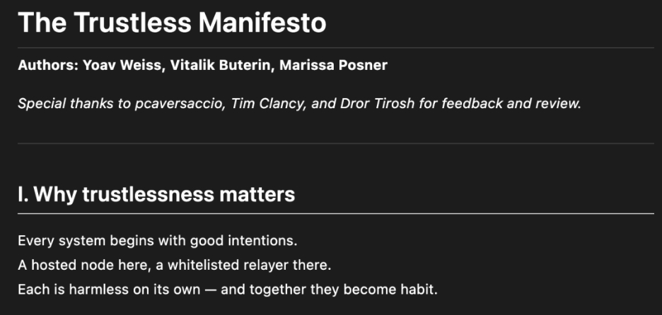 2025 年 11 月 13 日,以太坊联合创始人 Vitalik Buterin 与 Yoav Weiss、Marissa Posner 共同签署并发布《无需信任宣言》(The Trustless Manifesto)。