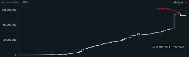 因此,如果某個市場(如 POPCAT/HYPE)崩盤,全域的 HLP 就會承受打擊。總體而言,HLP 一直非常盈利,並且長期來看他們一直在賺錢。總計他們已經產生了 1.18 億美元的淨利潤。與他們自成立以來積累的收益相比,這次 500 萬美元的攻擊顯得微不足道。
