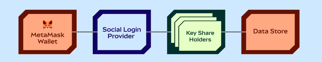 然后这个 TOPRF 通过典型 SSS(Shamir Secret Sharing,秘密分享算法),分片分发出去。而这些社交登录的服务商则会通过社交验证得到加密数据,还要结合用户的密码才能完全解密。