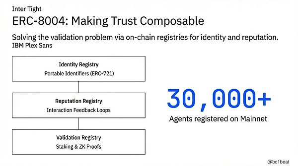 ERC-8004通过三个链上注册表协同工作,实现了信任的可组合性。