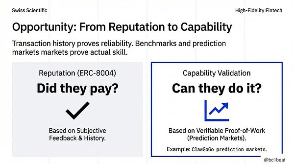 ERC-8004能回答的问题是:“他们付钱了吗?”这是一种基于交易记录的声誉机制,用于证明可靠性。
