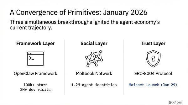 在 2026 年 1 月,三个基础性层级——支付、信任与社会协作——在短短数周内同时达到了可投入生产的成熟状态。