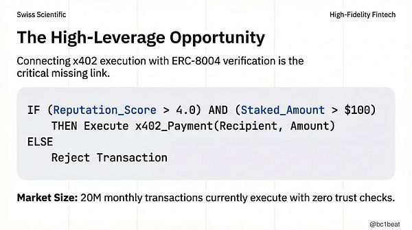目前,每月 2000 万笔交易在执行时完全没有任何信任校验。这是整个代理经济中杠杆最高的机会点。