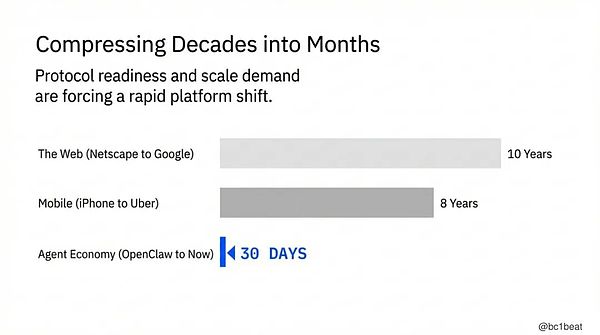 协议成熟度与需求规模,正在将几十年的平台演进压缩到数月。需求侧构建者的窗口期,现在已经打开。