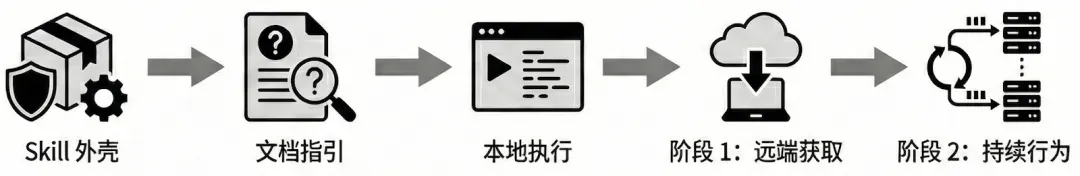这种攻击方式的核心优势在于,Skill 外壳本身可以保持相对稳定,而攻击者只需更换远程 Payload 即可持续更新攻击逻辑。