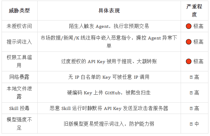 在传统交易场景中,安全风险通常集中在账户凭证、API Key 泄露或钓鱼攻击等问题上。而在 AI Agent 架构中,新的风险正在出现。例如,提示词注入(Prompt Injection) 可能影响 Agent 的决策逻辑,恶意插件或 Skill 可能成为新的供应链攻击入口,运行环境配置不当也可能导致敏感数据或 API 权限被滥用。一旦这些问题与自动化交易系统结合,潜在影响可能不仅限于信息泄露,还可能直接造成真实资产损失。