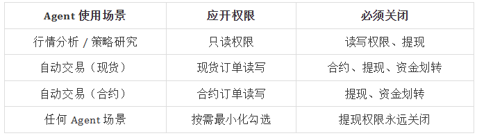 在 AI Agent 自动交易架构中,API Key 相当于 Agent 的“执行权限凭证”。Agent 本身并不直接持有账户控制权,它所有能够执行的操作,均取决于 API Key 被授予的权限范围。因此,API 权限边界既决定 Agent 能做什么,也决定在安全事件发生时损失可能扩大的程度。