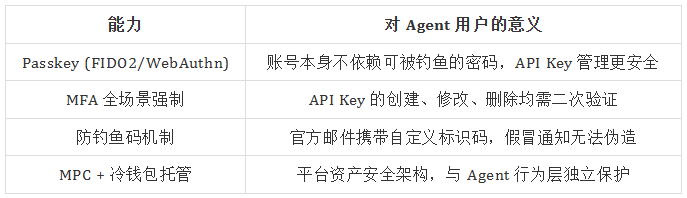 除了 Agent 相关的安全机制之外,交易平台本身的账户安全体系同样会对 Agent 用户产生重要影响。例如: