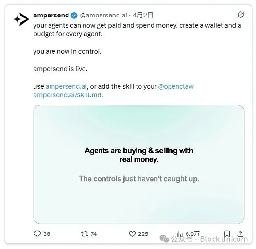 Ampersend 正好弥补了这一不足。它位于 x402 之上,提供了支付协议默认不包含的操作控制功能:每个代理的预算、自动充值、服务白名单、实时分析和合规性报告。