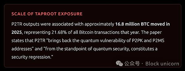 Taproot 是一次量子安全倒退。 P2TR 与 P2PK 类似,会将公钥暴露在链上,并且在 2025 年占所有比特币交易的 21.68%。