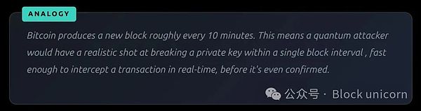 未来的量子计算机可以在大约 9 分钟内破解一个比特币私钥,这比比特币交易确认所需的大约 10 分钟还要短。这意味着攻击者有可能在比特币交易完成之前,甚至在交易过程中就将其窃取。