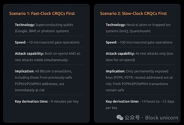 在快速时钟的 CRQC 上,9 分钟攻击是可行的,这意味着在单个比特币区块间隔内,有大约 41% 的概率可以推导出私钥。这意味着针对所有交易类型的在花费攻击都将成为现实。