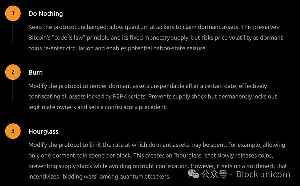 最具争议的提案:一种软分叉,使暴露的 P2PK 输出中的币无法花费,除非所有者通过抗量子方法证明其所有权。这将保护那些丢失了私钥的比特币所有者免受量子攻击者的窃取。