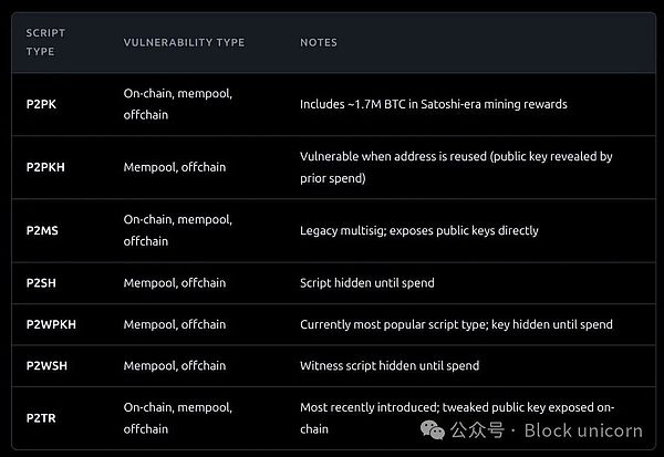 弱地址漏洞,锁定脚本直接泄露公钥(P2PK、P2TR、P2MS)。