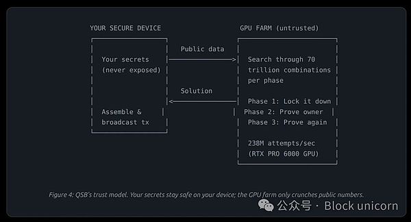 因此,QSB 使用 GPU(强大的显卡)搜索数万亿个候选结果,直到找到一个组合,使得比特币自身的验证系统接受该哈希输出作为有效的签名。安全性不再依赖于量子计算机可以破解的「锁钥」数学运算。相反,它依赖于哈希运算的不可逆性,而量子计算机对此无能为力。
